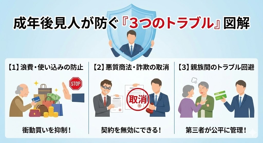 成年後見人が防ぐ「3つのトラブル」図解