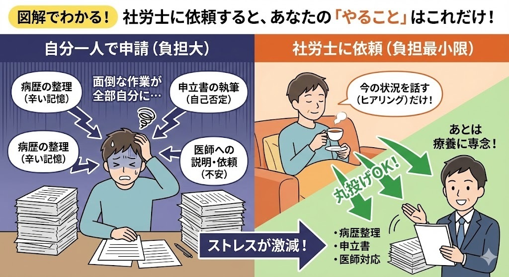 特にメンタルヘルス不調(うつ病や適応障害など)で申請される方にとって、自分ひとりで戦うことは大きなリスクを伴います。