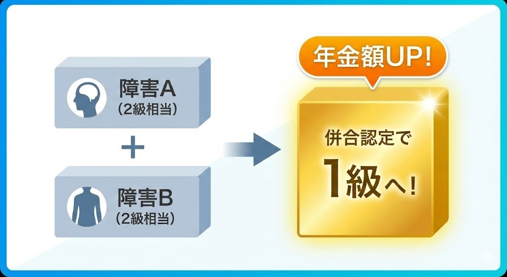 つまり、一つの病気だけでは「2級」止まりでも、別の病気の診断書を合わせることで、より受給額の高い「1級」を目指せる可能性があるのです。