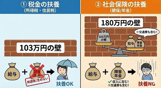 一般的に扶養といえば「103万の壁」や「130万の壁」が有名ですが、実は障害者の方には「180万円の壁」という特別な基準が適用されます。