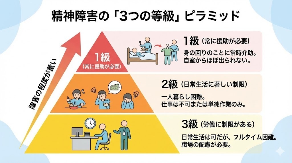 精神疾患の審査では、「その病気のせいで、日常生活や仕事にどれくらい制限があるか」で等級(1級~3級)が決まります。