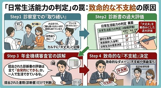 年金機構の審査官は、「なんだ、この人は家で一人で問題なく生活できているじゃないか。