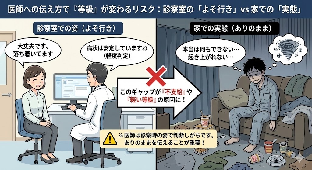 医師への伝え方で「等級」が変わるリスク:診察室の「よそ行き」vs家での「実態」