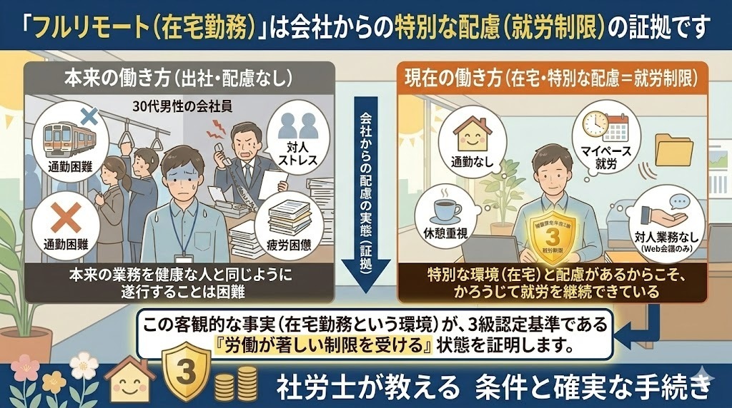 「在宅という特別な環境(配慮)があるからこそ、かろうじて就労できている」という事実は、3級の基準を満たす十分な理由になります。