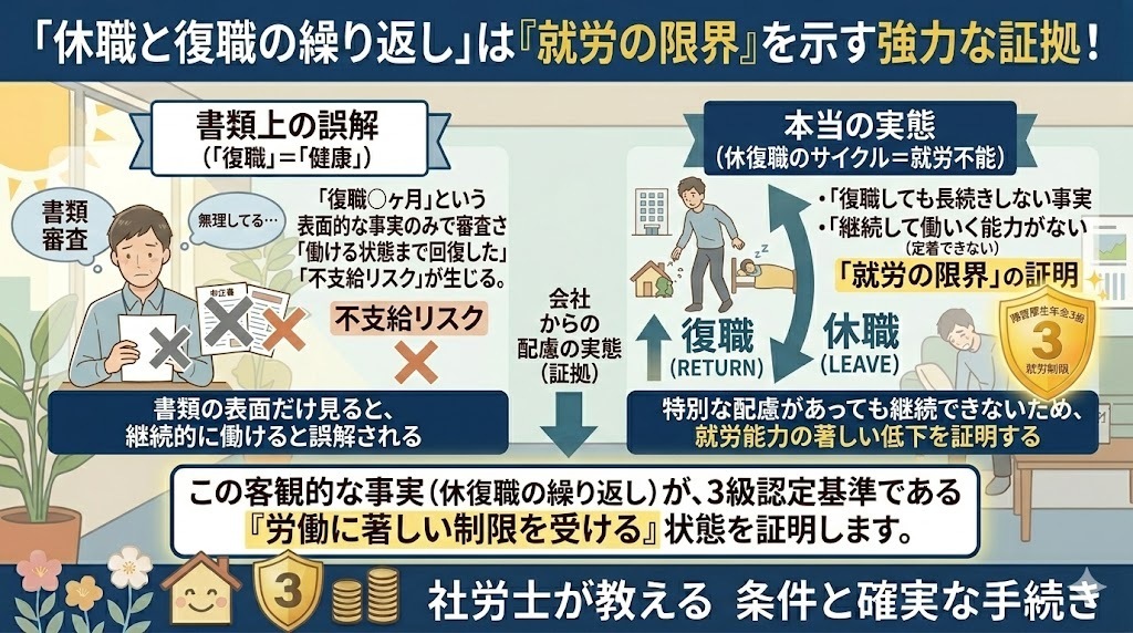 なぜ、「休職と復職の繰り返し」が審査で不利になってしまう危険があるのでしょうか。