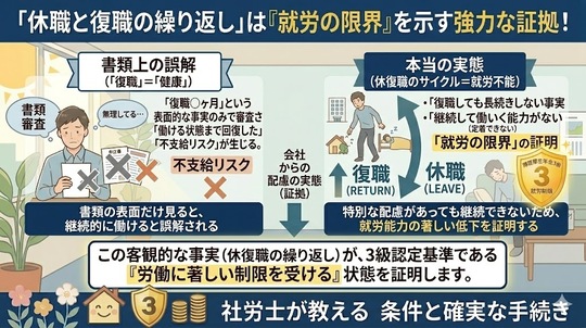 「復職と休職を繰り返している」ということは、裏を返せば「復職しても長続きせず、結局は休職に追い込まれてしまう(=継続的な就労能力が著しく低下している)」という決定的な事実の証明になります。