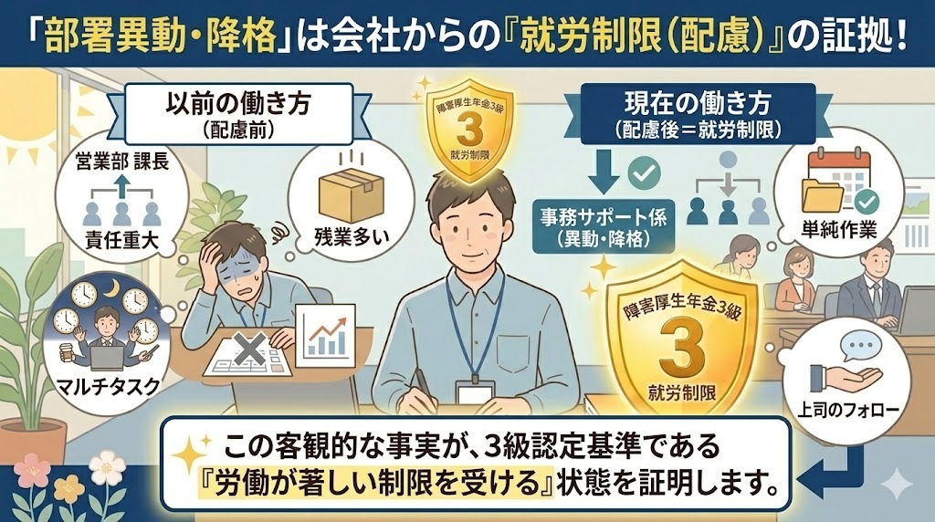 元の業務ができず、部署異動や降格といった配慮を受けている状態は、障害厚生年金3級の認定基準である「就労制限」に該当する可能性が十分にあります。