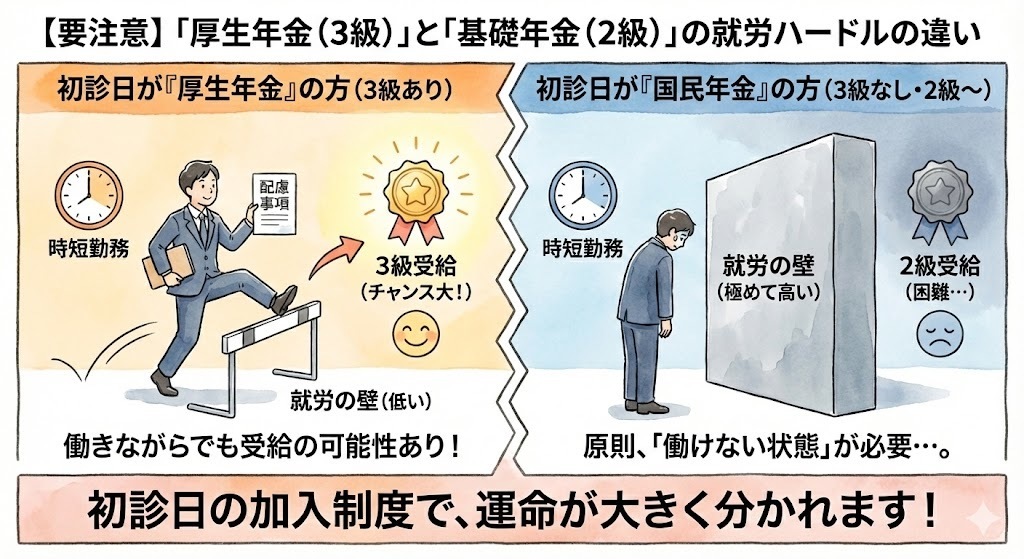 【要注意】「厚生年金(3級)」と「基礎年金(2級)」の就労ハードルの違い