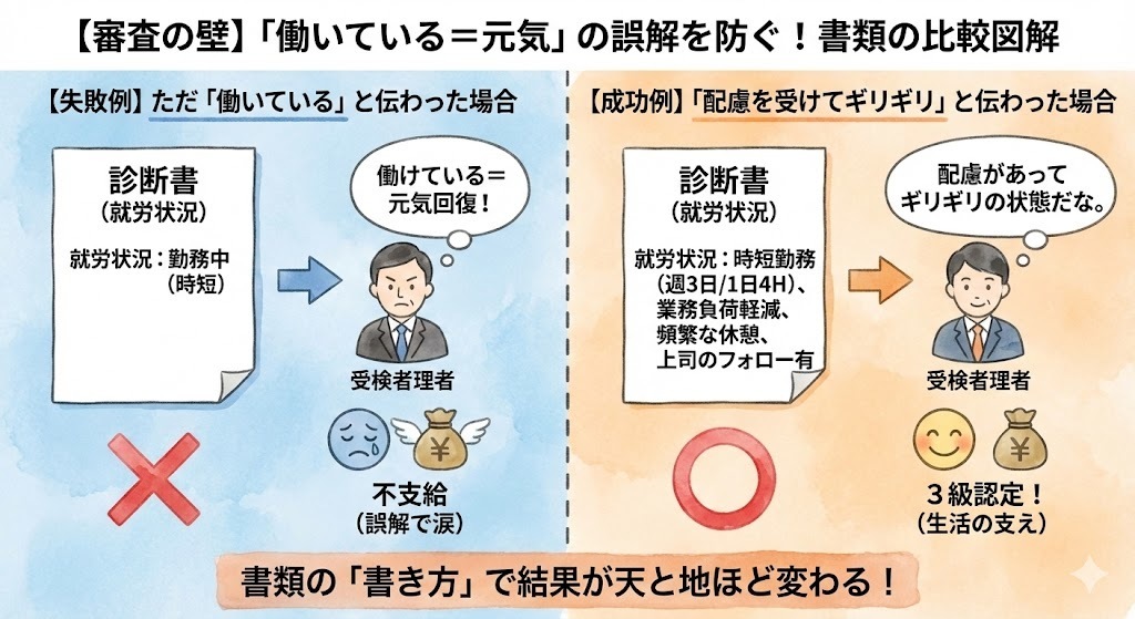 提出された書類の「就労状況」の欄に「〇〇株式会社で勤務」とだけ書かれていると、審査官は「あ、この人はもう普通に会社で働けるくらい回復したんだな」と機械的に判断してしまう危険性があります。