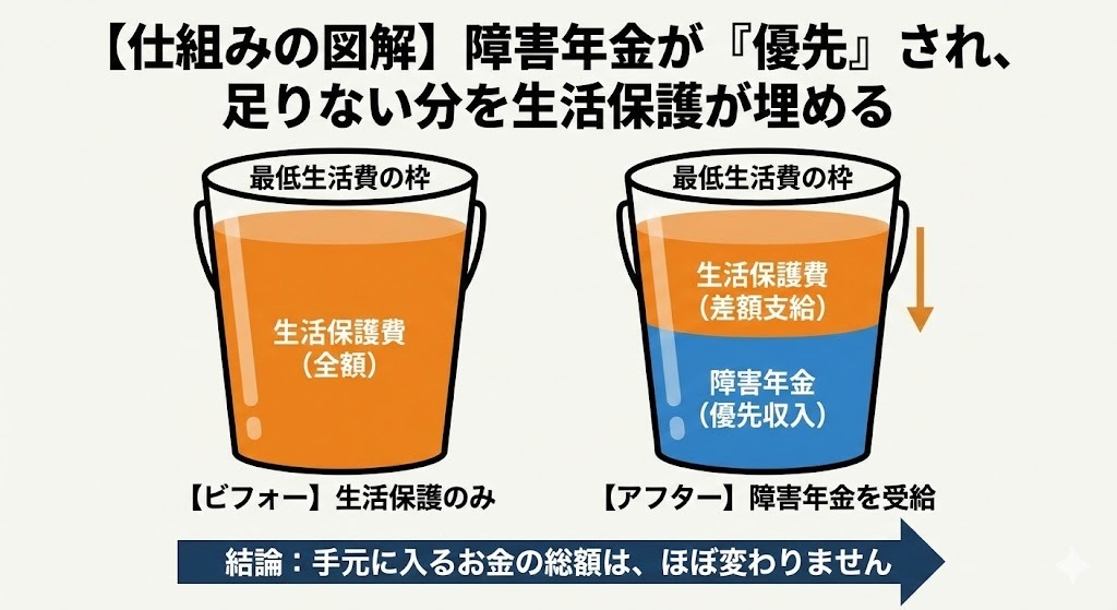 【図解】障害年金が「優先」され、足りない分を生活保護が埋める
