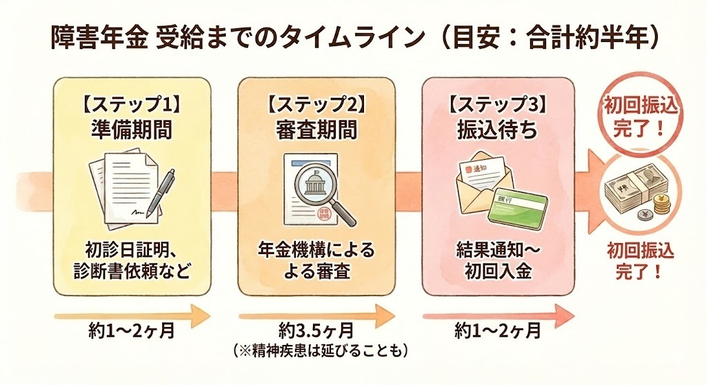 障害年金‗受給までのタイムライン(目安:合計約半年)