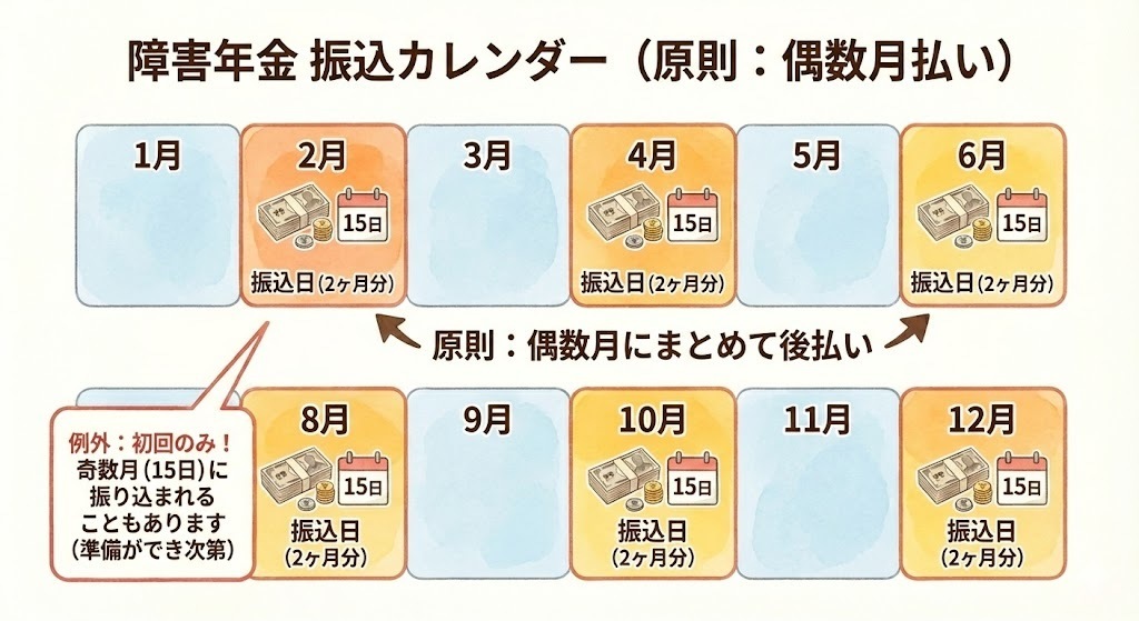 障害年金は、原則として「偶数月(2月、4月、6月、8月、10月、12月)の15日」に振り込まれます。