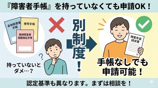 「手帳を持っていないと年金はもらえない」というのは大きな誤解です。手帳と年金は別の制度なので、手帳なしで年金だけ受給している方も大勢いらっしゃいます。