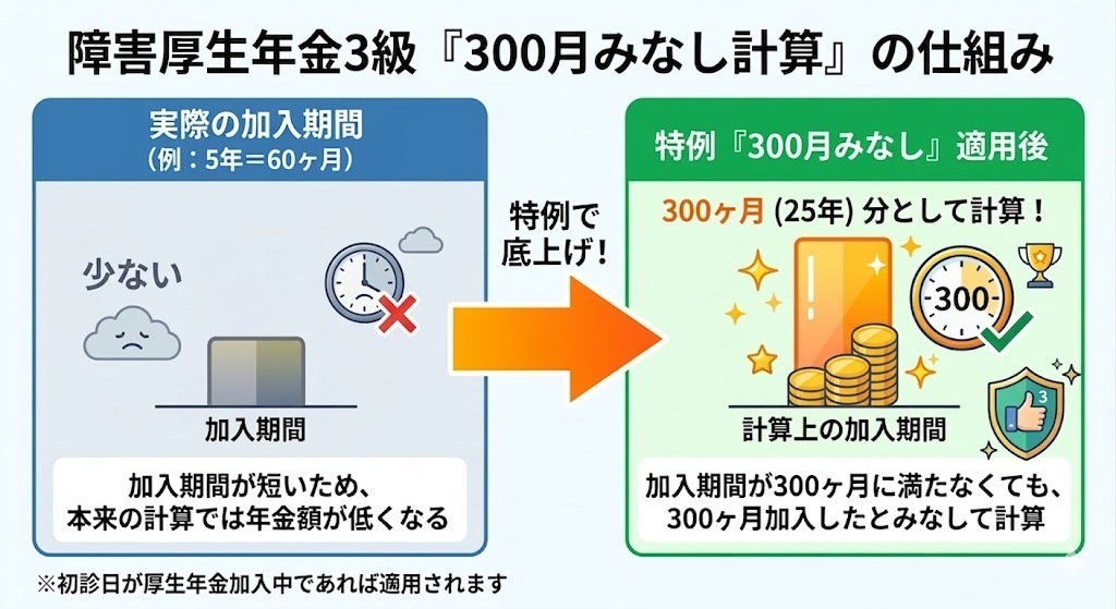 これは、加入期間が300ヶ月(25年)未満であっても、「最低でも300ヶ月(25年)は働いて保険料を納めたもの」として計算を底上げしてくれる非常に手厚い特例です。