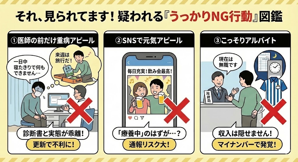 多くの人が心配するのは、犯罪レベルの不正ではなく、「日常生活での振る舞い」ではないでしょうか。実は、以下のような行動は、不正受給ではなくても「審査機関に疑念を持たれる」原因になり、次回の更新で不利になるリスクがあります。