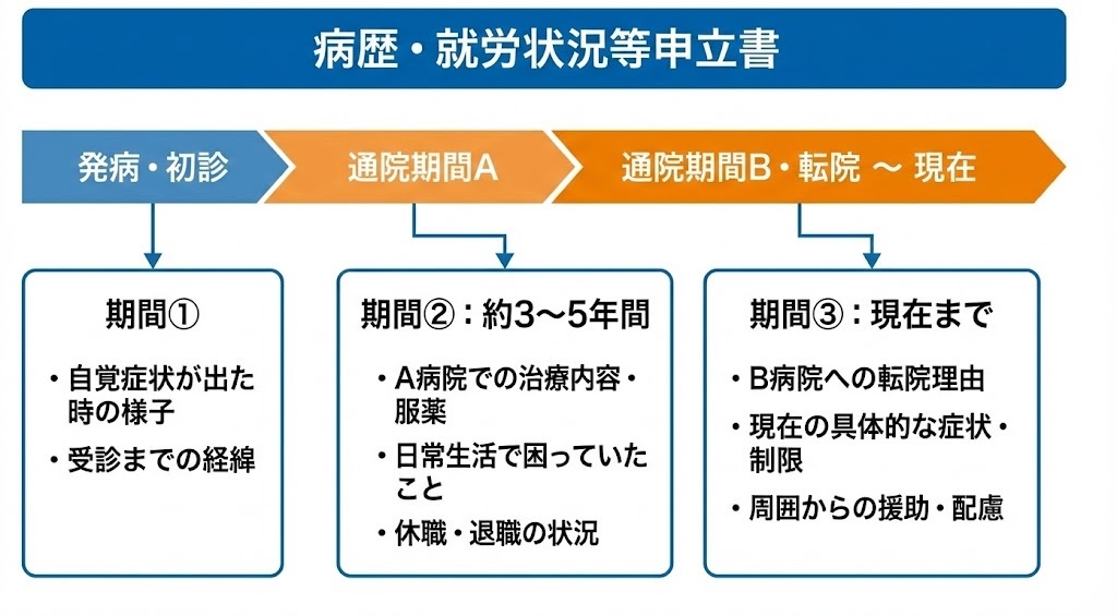 【図解】病歴・就労状況等申立書の構成イメージ|発病から現在までを期間ごとに整理する流れ