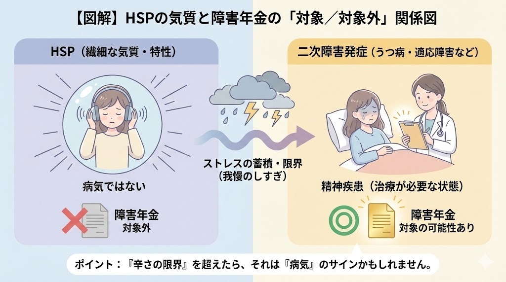 【図解】HSPの気質と障害年金の「対象/対象外」関係図
