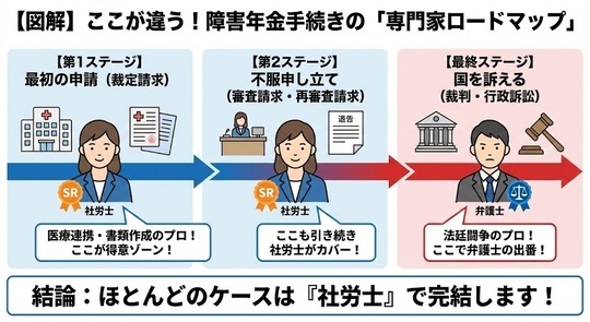 結論から言うと、最初の申請や審査請求(不服申し立て)までは「社会保険労務士(社労士)」、もしそれがダメで裁判(訴訟)をするなら「弁護士」を選ぶのが一般的です。