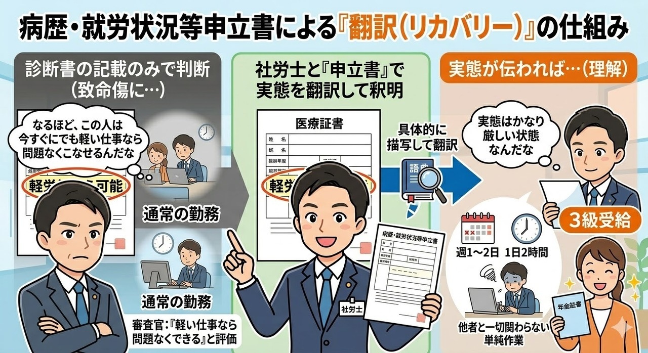 「軽労働なら可能」という一言は、確かにピンチではありますが、社労士の目から見れば「3級の土俵には十分に乗っている証拠」でもあります。
