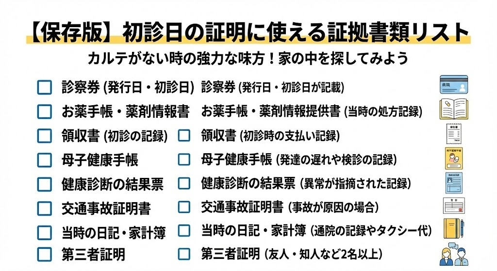 一つでは弱くても、複数を組み合わせることで「この時期に受診していた」という強い証明になります。