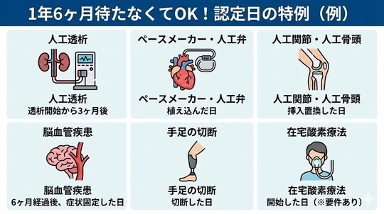 病気やケガの状態によっては、1年6ヶ月を待たずに「治療の効果が期待できない(症状固定)」とみなされ、その時点が障害認定日になる特例があります。