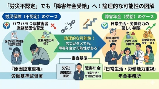 「労災不認定」でも「障害年金受給」へ!論理的な可能性の図解