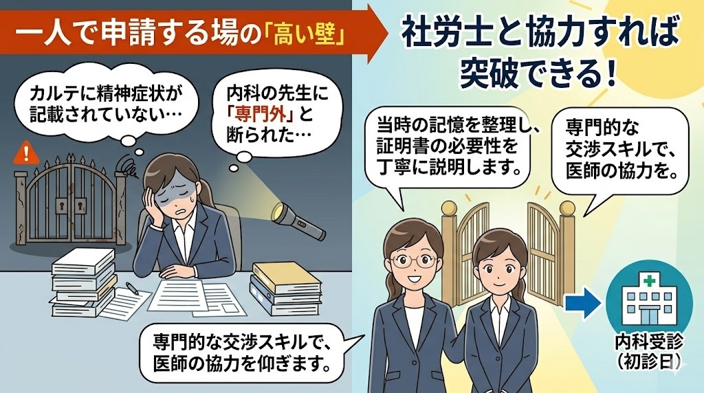 この壁を突破するためには、当時の通院履歴を整理し、内科の医師に対して「なぜこの証明書が必要なのか」「障害年金の制度上、どうしても先生の記録が頼りになること」を適切に説明し、協力を仰ぐ高度な交渉スキルが求められます。