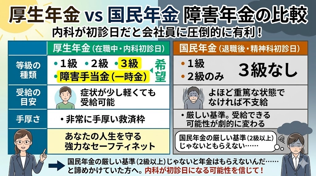 「内科を初診日にできるかもしれない」と気づいた会社員の皆様へ。この「3級」の存在がいかにあなたの人生を守る強力なセーフティネットになるかについては、【会社員は手厚い!】障害基礎年金と障害厚生年金の違い|3級のメリットを解説の記事で詳しく解説しています。ご自身の恵まれた権利をもらい損ねないよう、必ず確認しておいてください。