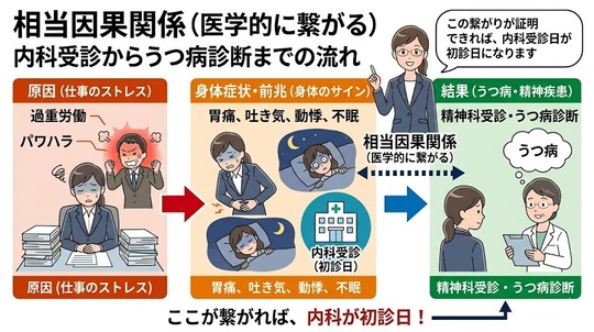 【図解】仕事のストレスによる胃痛(身体症状)と、その後のうつ病診断に「医学的な繋がり」があれば、初診日は精神科ではなく内科になります。
