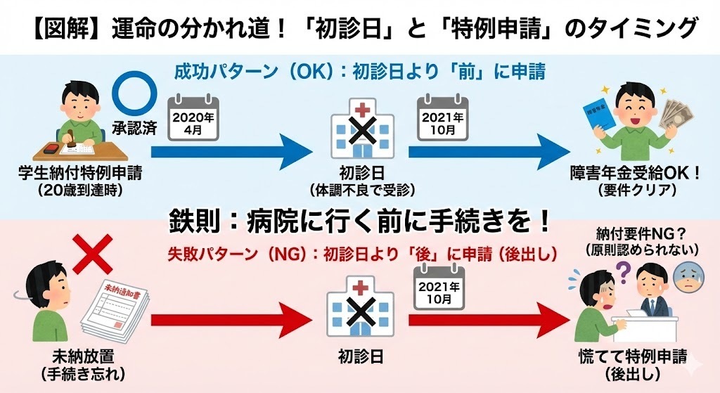 【図解】運命の分かれ道!「初診日」と「特例申請」のタイミング