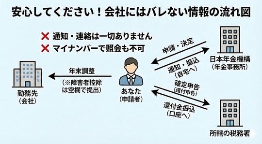 障害年金の申請・審査・決定は、すべて「あなた(個人)」と「日本年金機構(国)」の間だけで完結します。決定通知書も、年金の振込通知も、すべてあなたの自宅に郵送されます。会社を経由することは一切ありません。