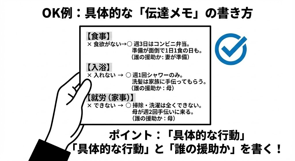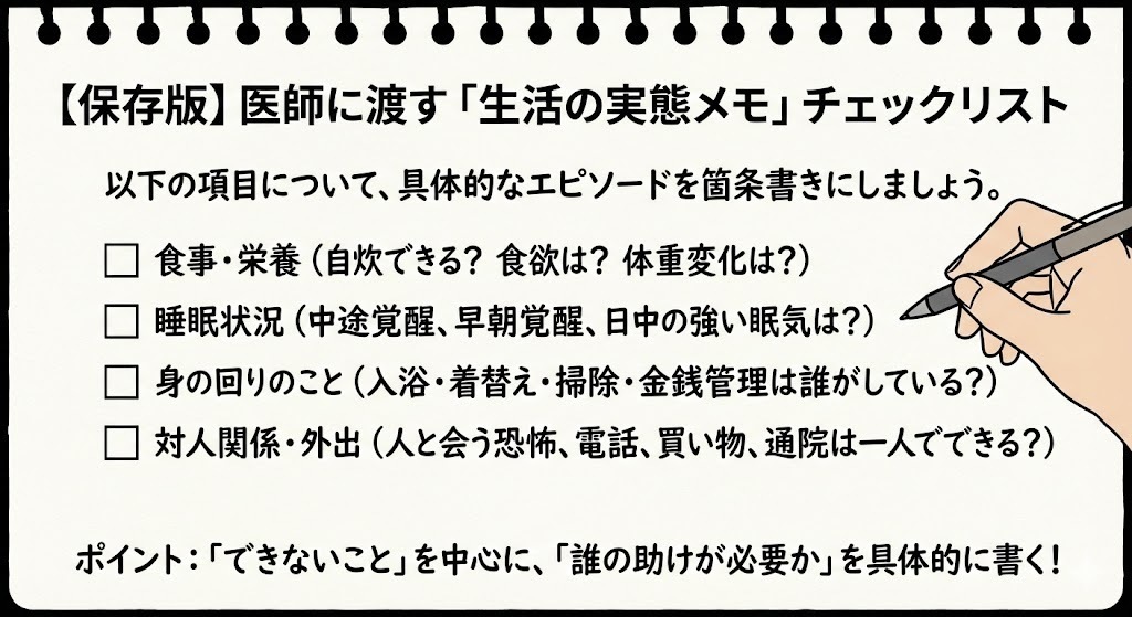 このように、「具体的なエピソード」と「誰の援助を受けているか」を書くことで、医師は診断書の該当箇所に丸をつけやすくなります。