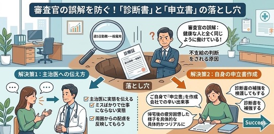 それは、医師に書いてもらう「診断書」の就労状況欄に、ただ単に「週5日勤務・一般雇用」とだけ書かれてしまうことです。